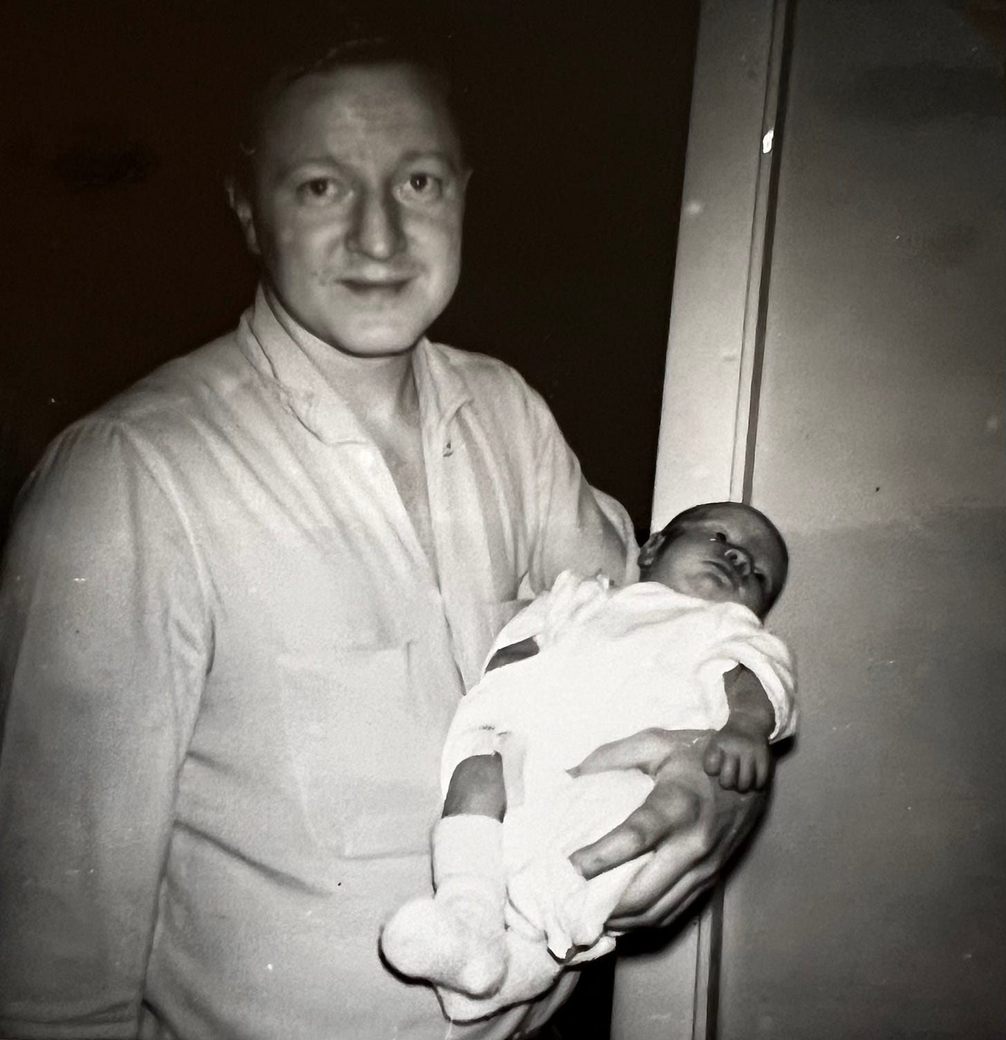 Dad is holding his newborn son, my brother Chuckie. Dad was six-feet-two, so I had to stand on the sofa to capture this one, in March 1963. Four months later, I turned six.