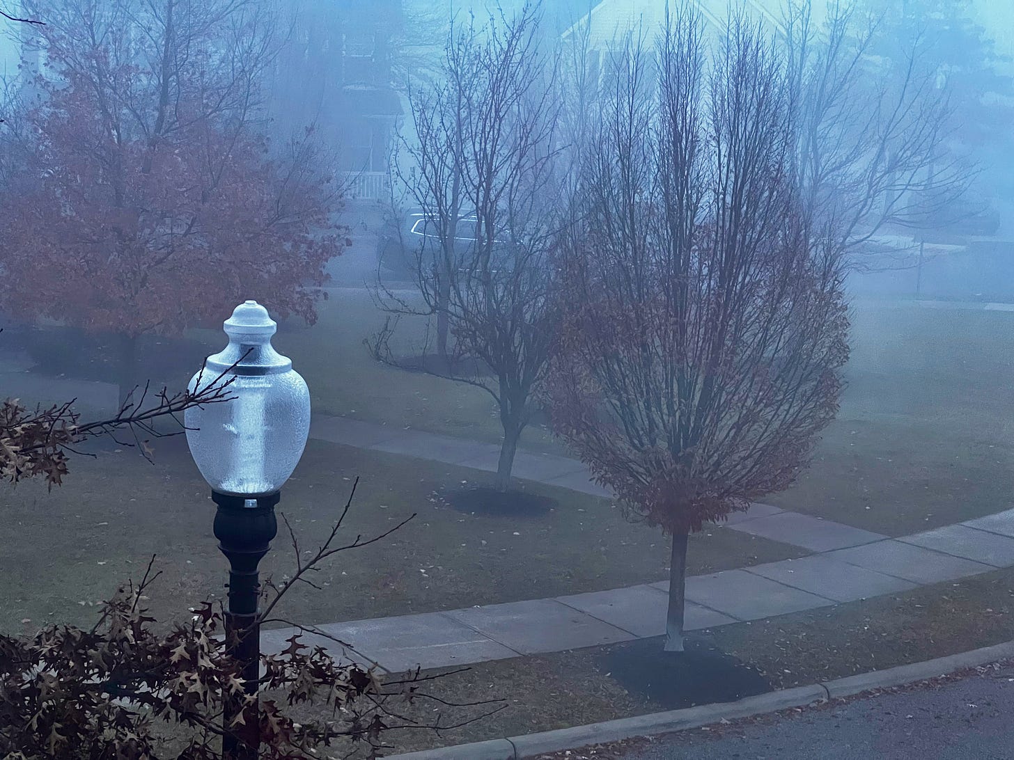This photo of the streetlight outside our bedroom window on a foggy morning reminds me of London in Mary Poppins’ day. I think of Mary’s magical tapestry bag, and how our 9-year-old granddaughter, Jackie, compares me to her whenever I carry my green purse, which is about the size of carry-on luggage. At a recent lunch, Jackie sat next to me and imitated me digging through it.